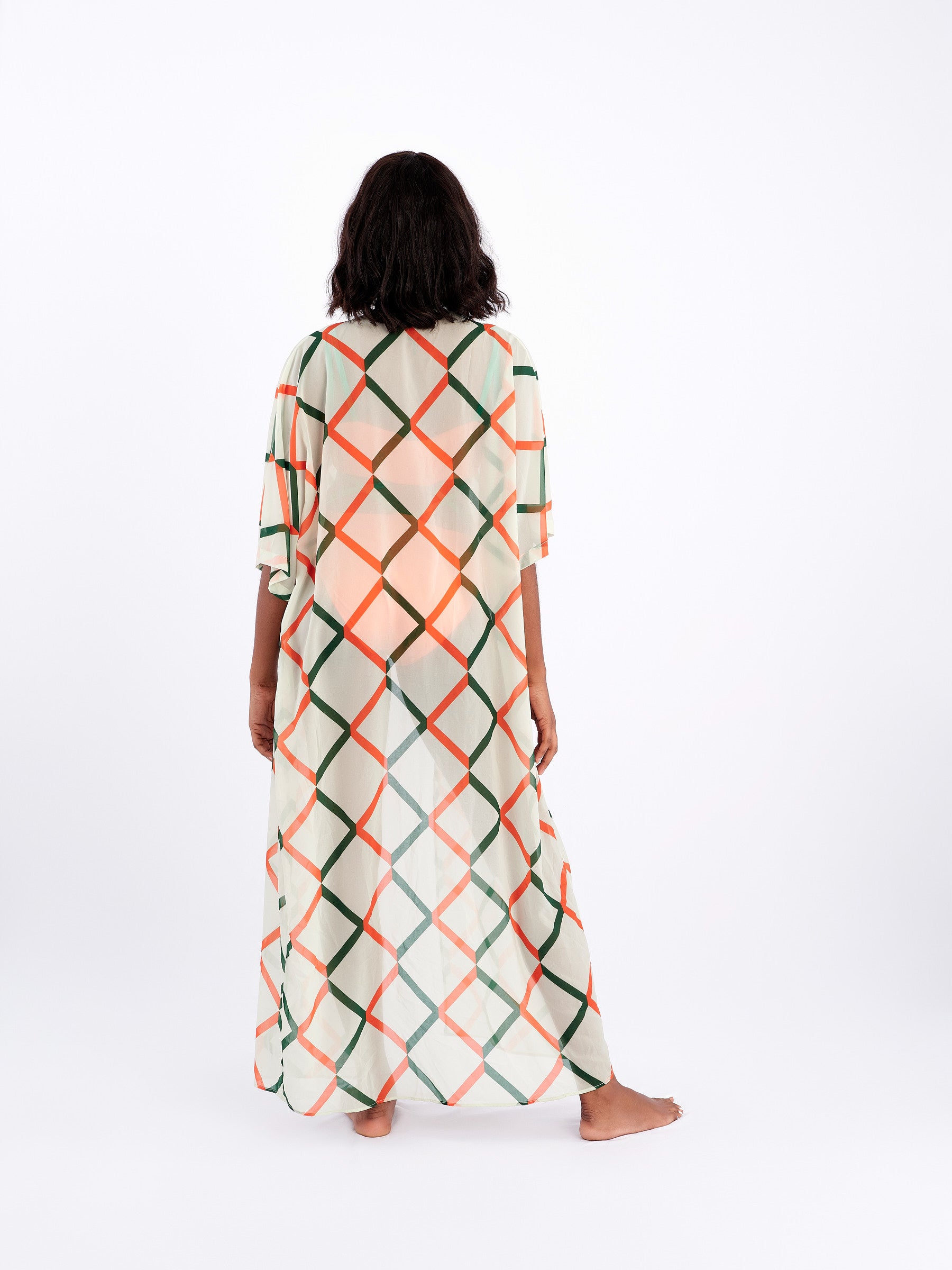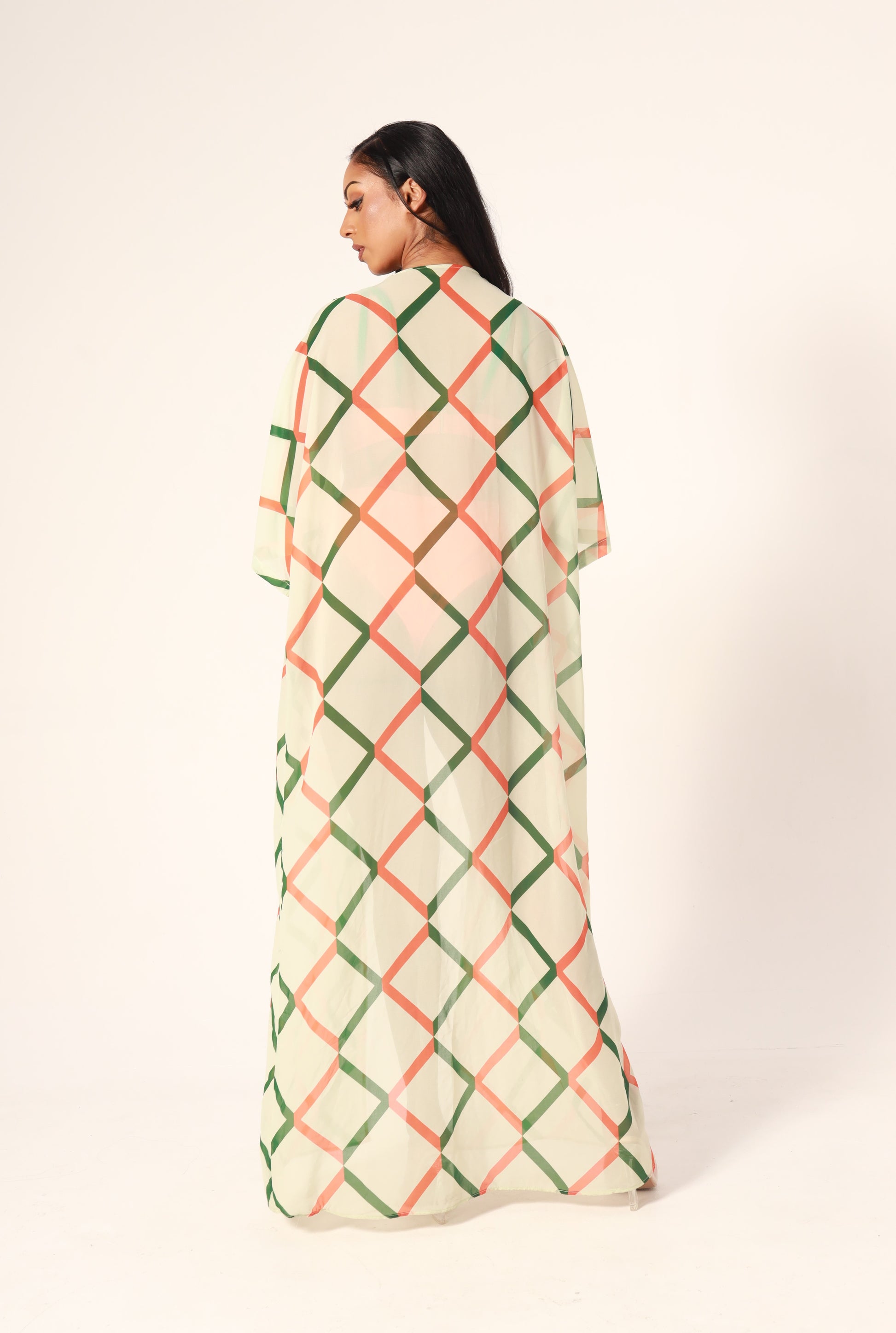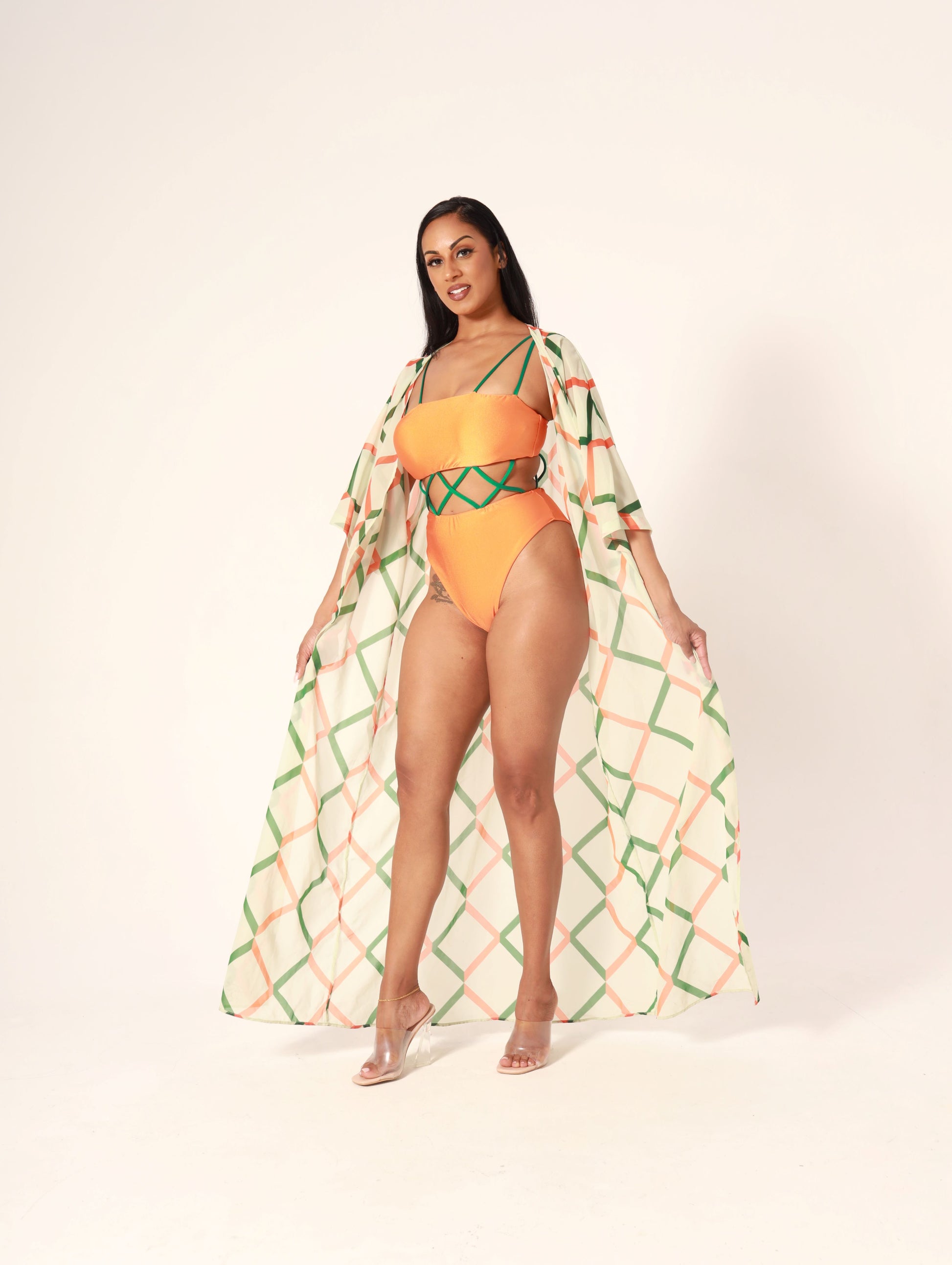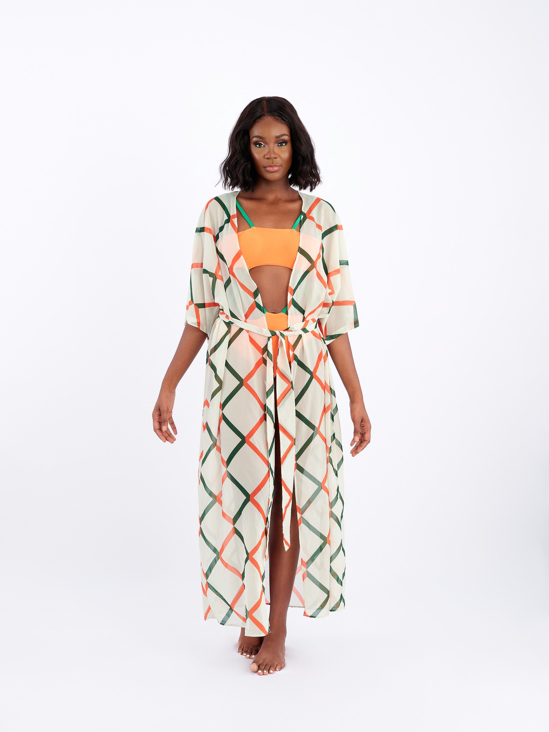 The Palm Robe is a reflection the palm tree leave in its flourishment, customed made print in a soft chiffon fabric ,the flowy silhouette gives a vibe of ease and luxury. The Palm robe with the palm pineapple swimwear make a perfect pair.